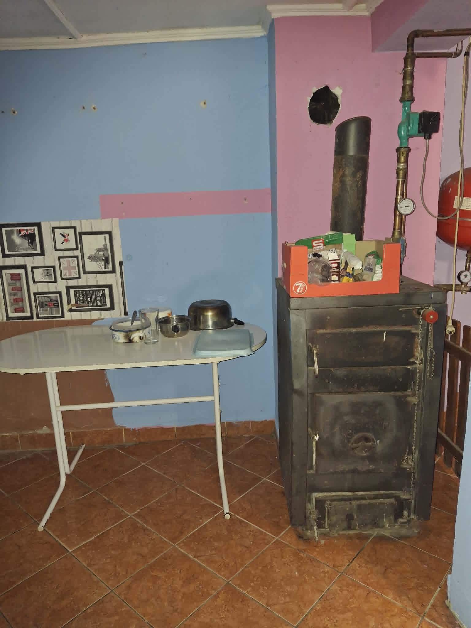 De centrale verwarming werkt op hout maar het is niet over het hele huis voorzien de radiatoren.