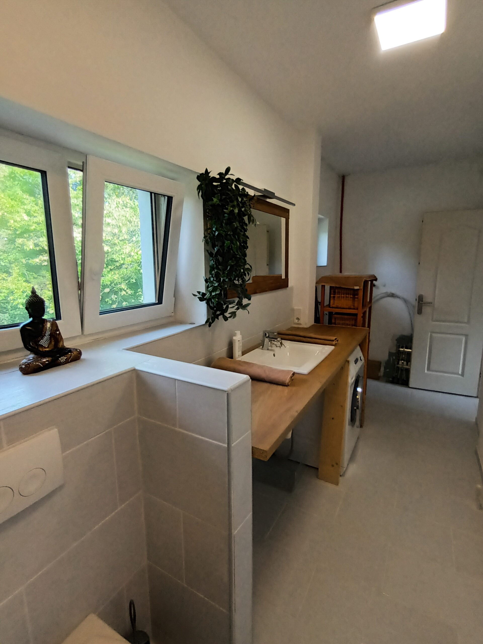 Badkamer 9,5 m2 met douche, hang toilet, wasmachine.