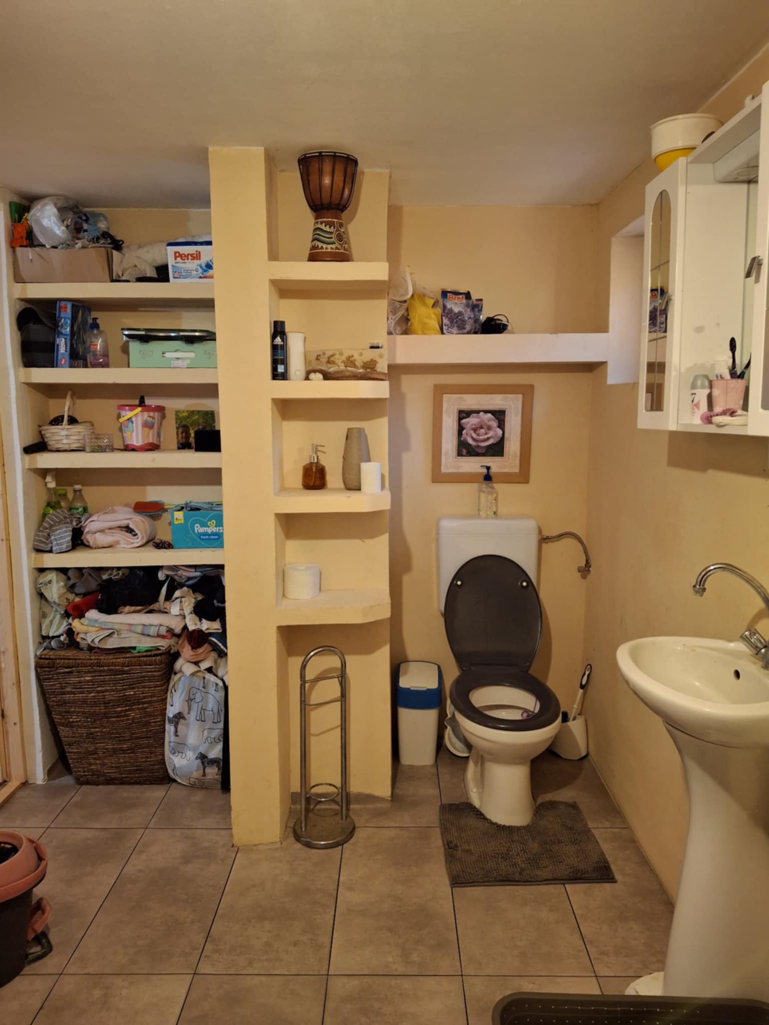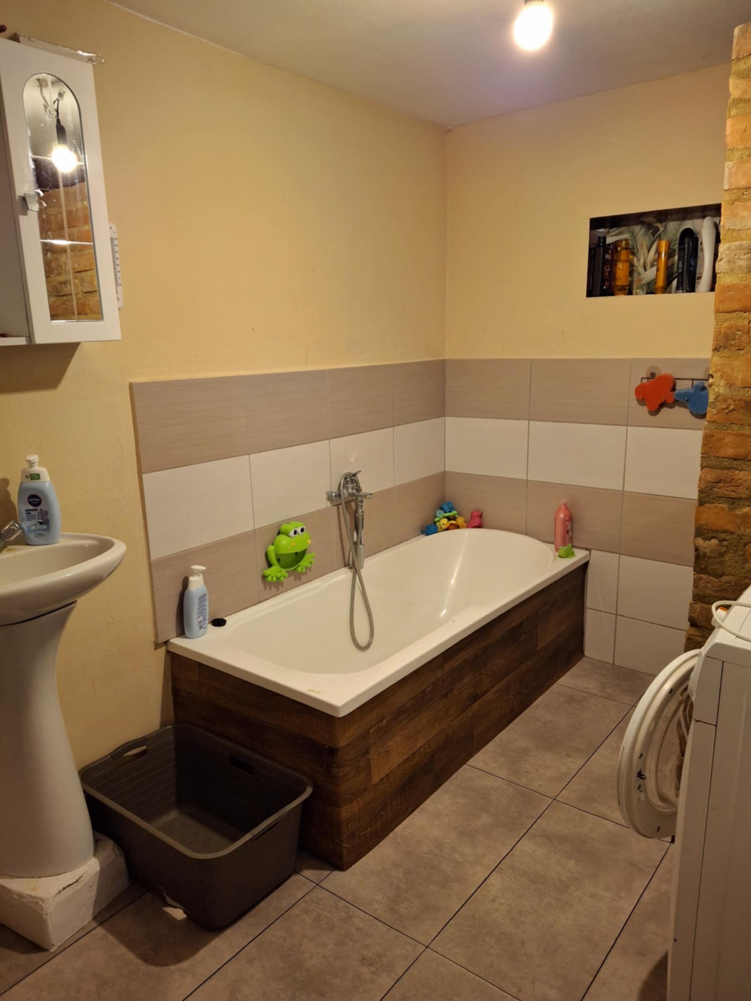 Badkamer 8 m2 met ligbad, douche, lavabo en toilet.